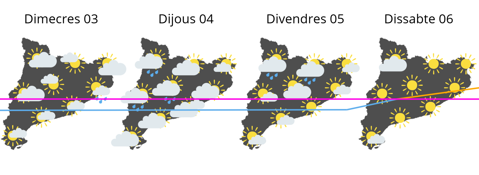 Per a aquests dies, passos de front procedents de l’oest de la península ibèrica i que ens arribaràn desgastats, deixant precipitacions minses al quadrant nord-oest. Persisteixen les baixes temperatures, restant per sota de la mitjana fins a divendres, tendint a l’alça arribant a valors més normals per a l’època. De dimecres a divendres desprès dels fronts desgastats ens deixarà vent de nord amb tramuntana a les comarques de l’empordà, i mestral a Terres de l’Ebre.
